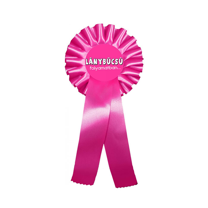 Díjszalag – Lánybúcsú – Szalagos kitűző_x000D_\n_x000D_\nLánybúcsúra remek hangulatfokozó ajándék, ha a menyasszonyra aggatunk egy díjszalagot, mely az alkalom fontosságáról árulkodik.Ajándékozd meg egy szalagos kitűzővel, mert díjszalagot nem csak versenyen lehet kiérdemelni. A bulik hangulatát feldobja egy díjszalagos kitűző, például a legnagyobb sörivó, pálinka ivó vagy borivó címért vívott küzdelemben a győztesé lehet a megtiszteltetés, hogy viselheti. De hozzátartozóinkat is dicsőíthetjük a legjobbaknak járó kitűntetésekkel._x000D_\n_x000D_\nA kokárda rész átmérője 11,3 cm , a szalaggal együtt 26 cm nagyságú.
