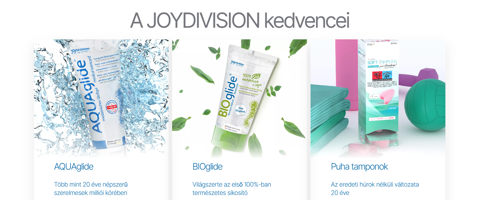 A JOYDIVISION international GmbH 30 éve a vezető német gyártó és szakértő a prémium személyes termékek terén az intim ápolás és a szexuális jólét terén. 100%-ban Európában fejlesztett és gyártott egészségügyi termékeket gyártó cég vagyunk. A világ első 100%-ban természetes síkosítójának, a BIOglide-nak és a milliószorosan népszerű síkosítómárkának, az AQUAglide-nak az innovatív feltalálójaként a JOYDIVISION országos és nemzetközi szinten is  nevet szerzett magának.