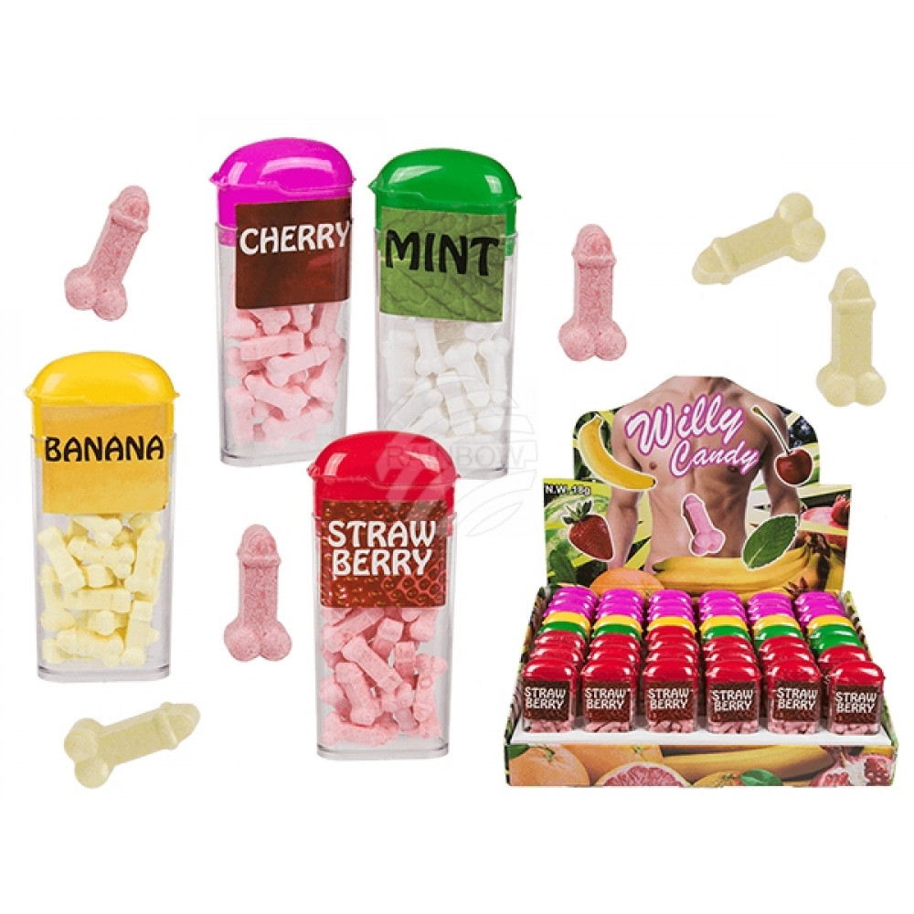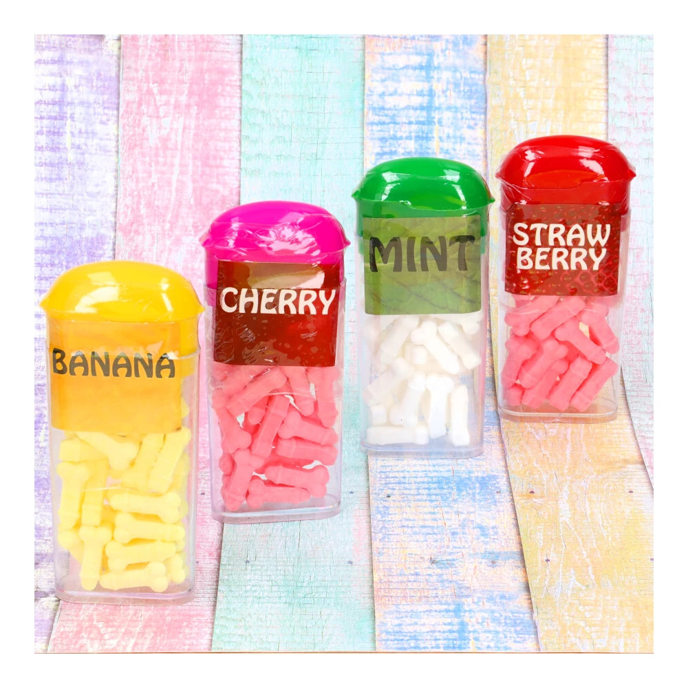 Pénisz alakú gyümölcscukorka. Nagyszerű ajándék leánybúcsúra. Aranyos, csintalan ajándék. Cseresznye, eper, mentol és banán ízekben.