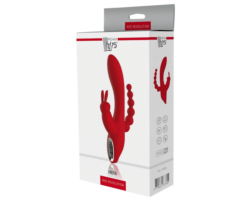 Tapasztalja meg az intenzív élvezetet a hármas stimulációnak köszönhetően. A Dream Toys Red Revolution Hera vibrátor nemcsak a G-pontot és a csiklót kényezteti, hanem az anális stimulációról is gondoskodik. 2 nagy teljesítményű motorral működik, és 7 vibrációs és pulzációs módot kínál. Fedezze fel a változatosságot, és szerezzen magának maximális élvezetet.