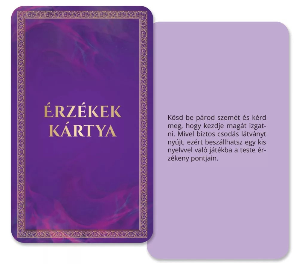 Az Érzékek Játéka nem egy átlagos felnőtt társasjáték. Egyedülálló módon nem csak a teljesítményre, hanem a lelki és testi kommunikációra helyezi a hangsúlyt. Itt nem „csinálni kell” valamit – hanem jelen lenni egymással. Több mint erotikus társasjáték – egy valódi kapcsolódási