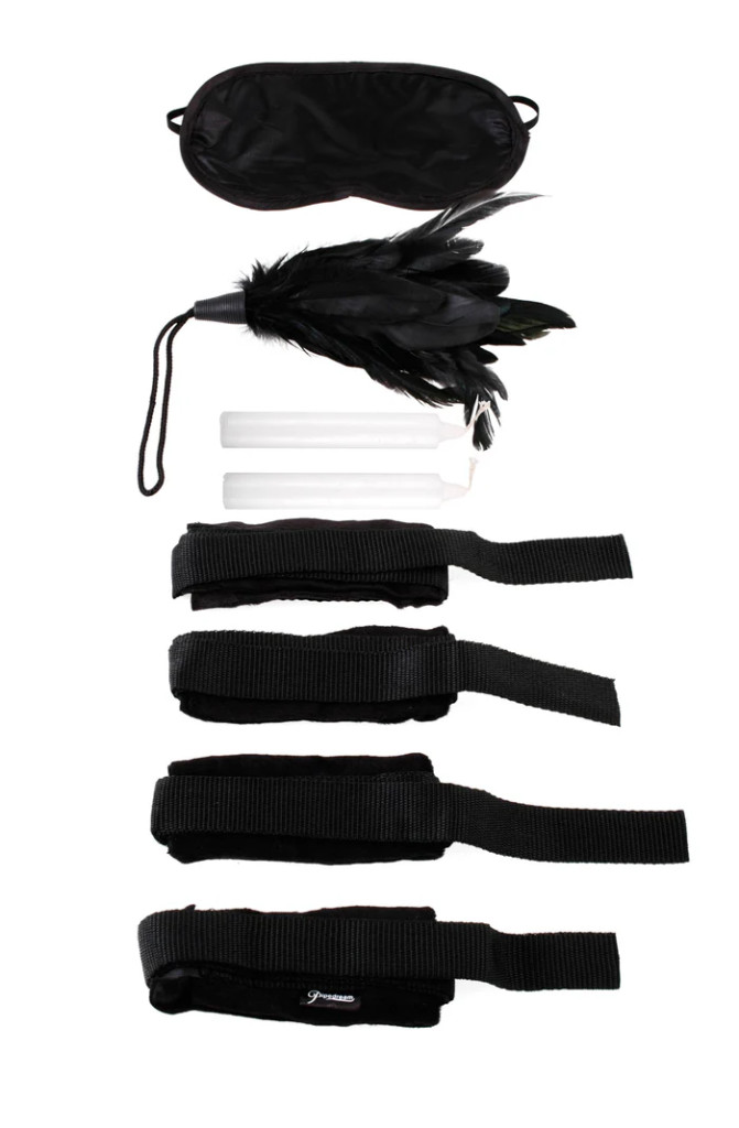 Fedezzétek fel egymás pajzán oldalát ezzel a minden az egyben kezdőknek való készlettel. Tökéletes azoknak a pároknak, akik valami újat és izgalmasat szeretnének kipróbálni. Ez a szett mindent tartalmaz, amire egy játékos szenvedélyes éjszakához szükséged lehet: (4) bársony bilincs nejlon megkötőkkel, egy puha tollcsiklandozó és egy ingyenes szatén szemkötő.