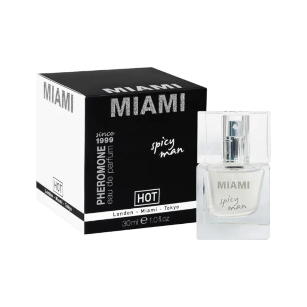 A HOT MIAMI  Spicy Man férfiaknak készült  új, rendkívüli illatú, csábító és fűszeres parfüm válogatott illatokkal,  hihetetlenül közkedvelt illat. A termékben található feromonok vonzzák az ellenkező nemet, láthatatlanok és szagtalanok, így tudat alatt hatnak. Kizárólag kiváló minőségű feromonokat alkalmaznak, amelyek már régóta elismert szexuális csalogatószerek.