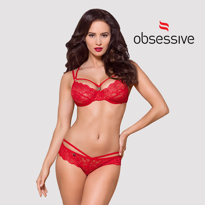 Ez a szexi szett érzéki fekete vagy piros színben kapható, és feltűnő csipkével díszített. A szett mindkét felét rugalmas pántok díszítik, gyönyörűen kiemelve az íveket. A puha, merevítős melltartó csillogó, ékszerszerű gyűrűvel rendelkezik a kosár csatlakozásánál. A szetthez illő tanga is tartozik.
