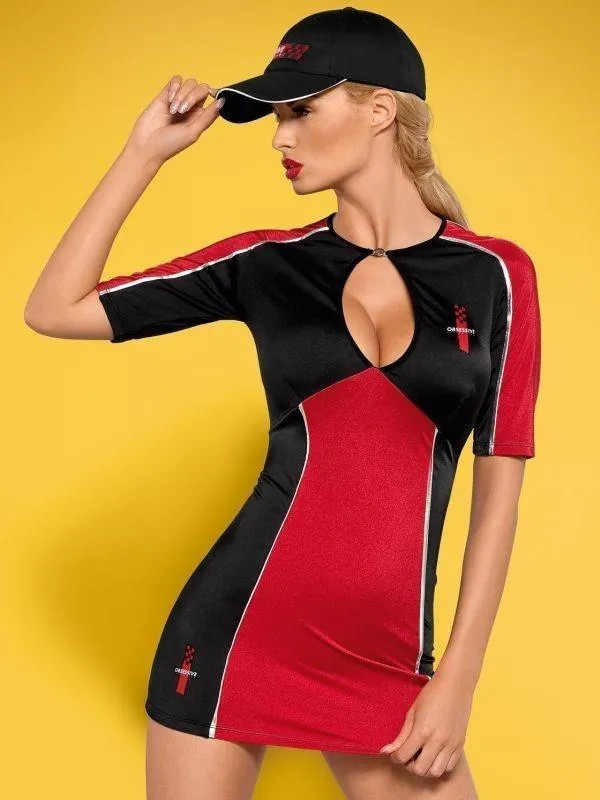 Ez a piros-fekete ruha ezüst szegéllyel, Obsessive logós nyakcsattal, mélyen kivágott nyakkal és testhez simuló anyaggal rendelkezik. Két rally jelvénnyel díszített. Egy szexi fekete tangával és egy piros hímzéssel díszített fekete, napellenzős sapkával érkezik.