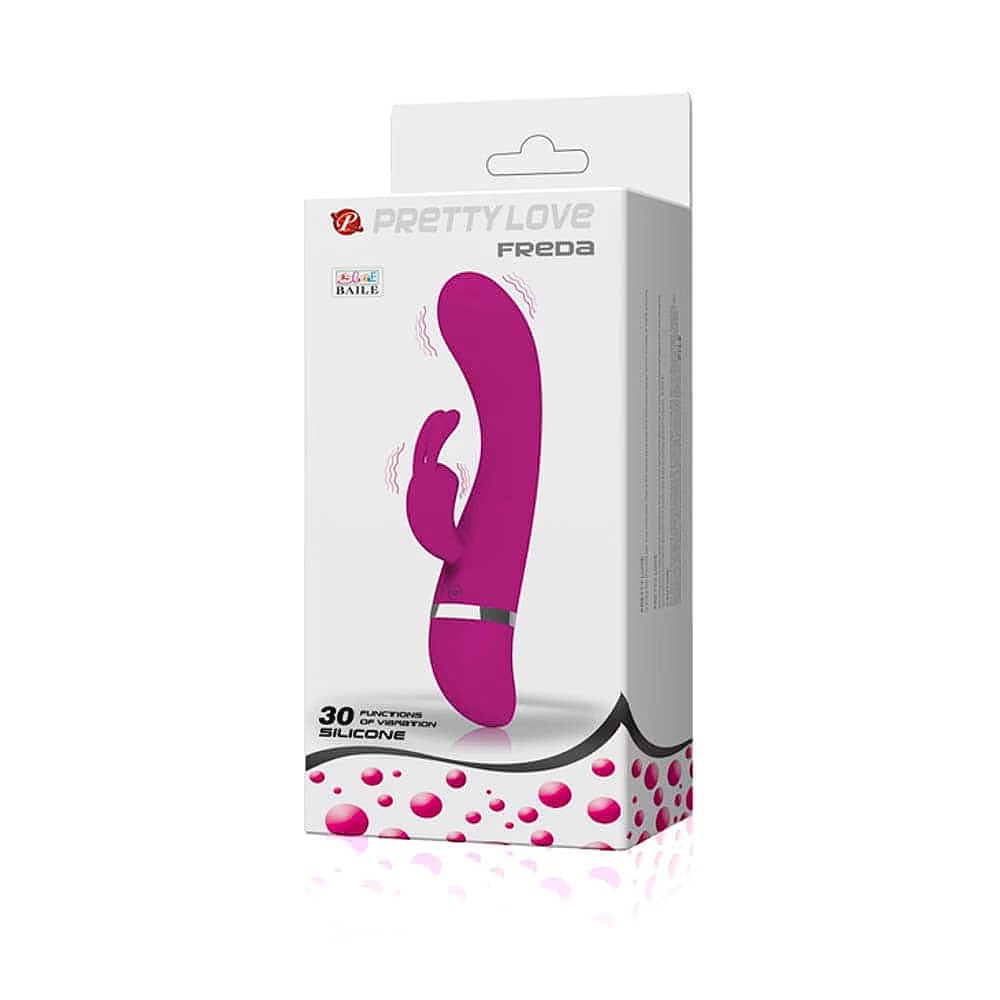 A Pretty Love Freda vibrátor egy stílusos és erőteljes vibrátor. Egyedi formája és kis oldalsó meghosszabbítása kiválóan stimulálja az intim területeket. Az ívelt hüvelyfal és a G-pont egyidejű stimulálására szolgál. A nyúl alakú, puha fülekkel ellátott klitoriszizgató gyengéden simogatja a csiklót. A Freda szilikonból készült, puha és gyengéd tapintású, hipoallergén és teljesen biztonságos a használata. A játék felülete teljesen sima, így megakadályozza a sérülést használat közben. A masszírozó méretei megfelelnek a női nemi szervek természetes stimulációs igényeinek, lehetővé téve a maximális kényelmet!