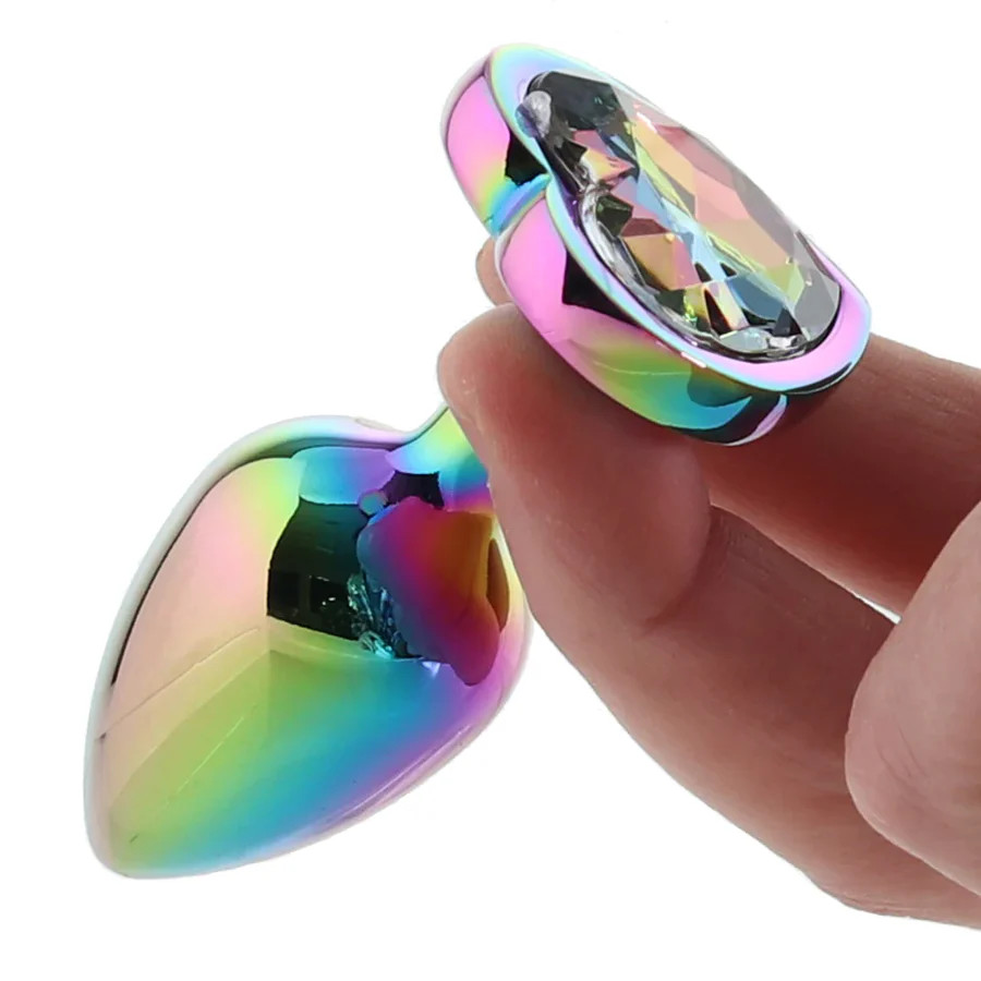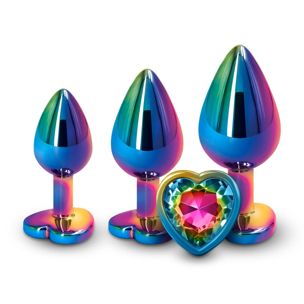 NS Novelties, Rear Assets többszínű szivárványos szív alakú anális dugó készlet az NS Novelties-től. A termék alumíniumból készült. Ez a káprázatos, színváltós szivárvány színeiben pompázó, kristályokkal díszített vízálló edzőkészlet három krómozott, fokozatosan növekvő méretű dugót tartalmaz, amelyek a könnyed behatolás érdekében formázottak. Ideálisak egyéni vagy partneres játékhoz, testbarátak. Minden típusú síkosítóval használható! A termékek temperálhatóak, azaz hűthető vagy melegíthetőek használat előtt.