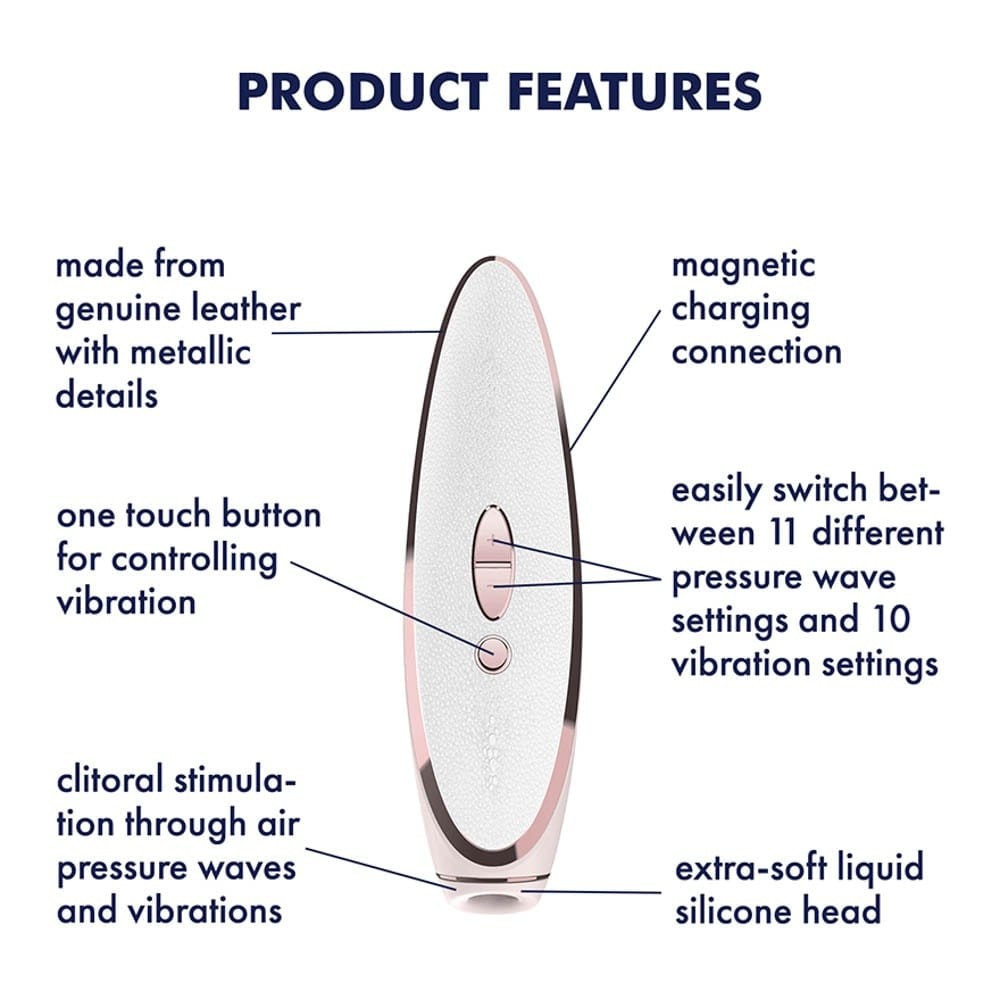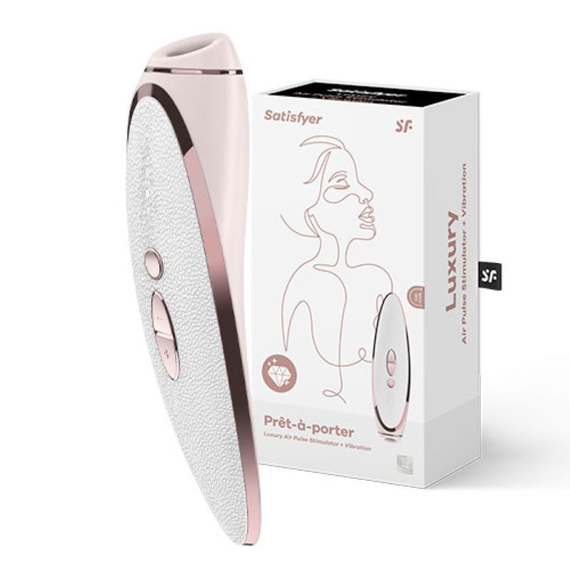 Különleges anyagaival, mint a fehér bőr, a rózsaarany díszítések és a puha, orvosi minőségű szilikon, ez a játékszer kifinomult érintéseket társít az Ön kifinomult ízléséhez, csiklója legnagyobb megelégedésére. A Satisfyer Prêt-à-porter eszközt elbűvölően elegáns formája teszi egyedülállóvá.  A rendkívül puha szilikonból készült, levehető fej gyengéden simogatja és különféle nyomáshullám- és vibrációprogramokkal kényezteti csiklódat. A Prêt-à-porter két egymástól függetlenül vezérelhető motorjával összesen 11 különböző intenzitású nyomáshullám és 10 vibrációs program közül választhatod ki a kedvencedet. Ily módon számos kombinációs lehetőség van, amelyek élvezetes csúcspontokkal gondoskodnak az ultimatív élvezetről.