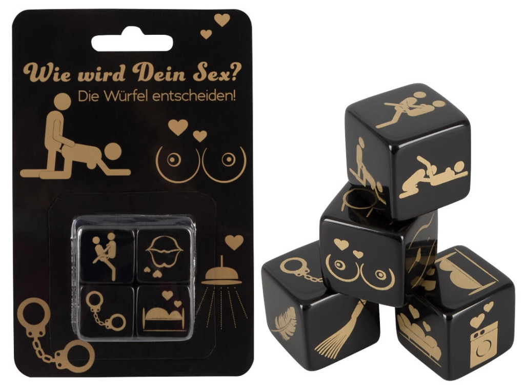 • 4 db erotikus dobókocka, különböző témákkal (pl. testrészek, helyszínek, pozíciók, eszközök)